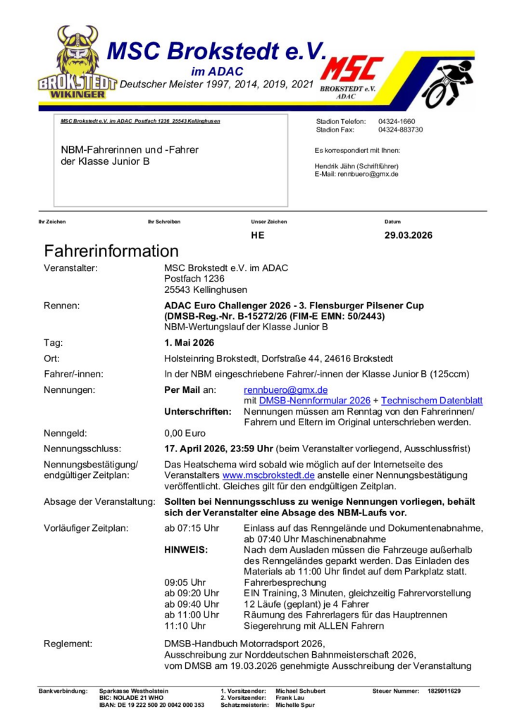 • ++Fahrerinfo zum NBM-Lauf am 1. Mai 2026++ 30. März 2026